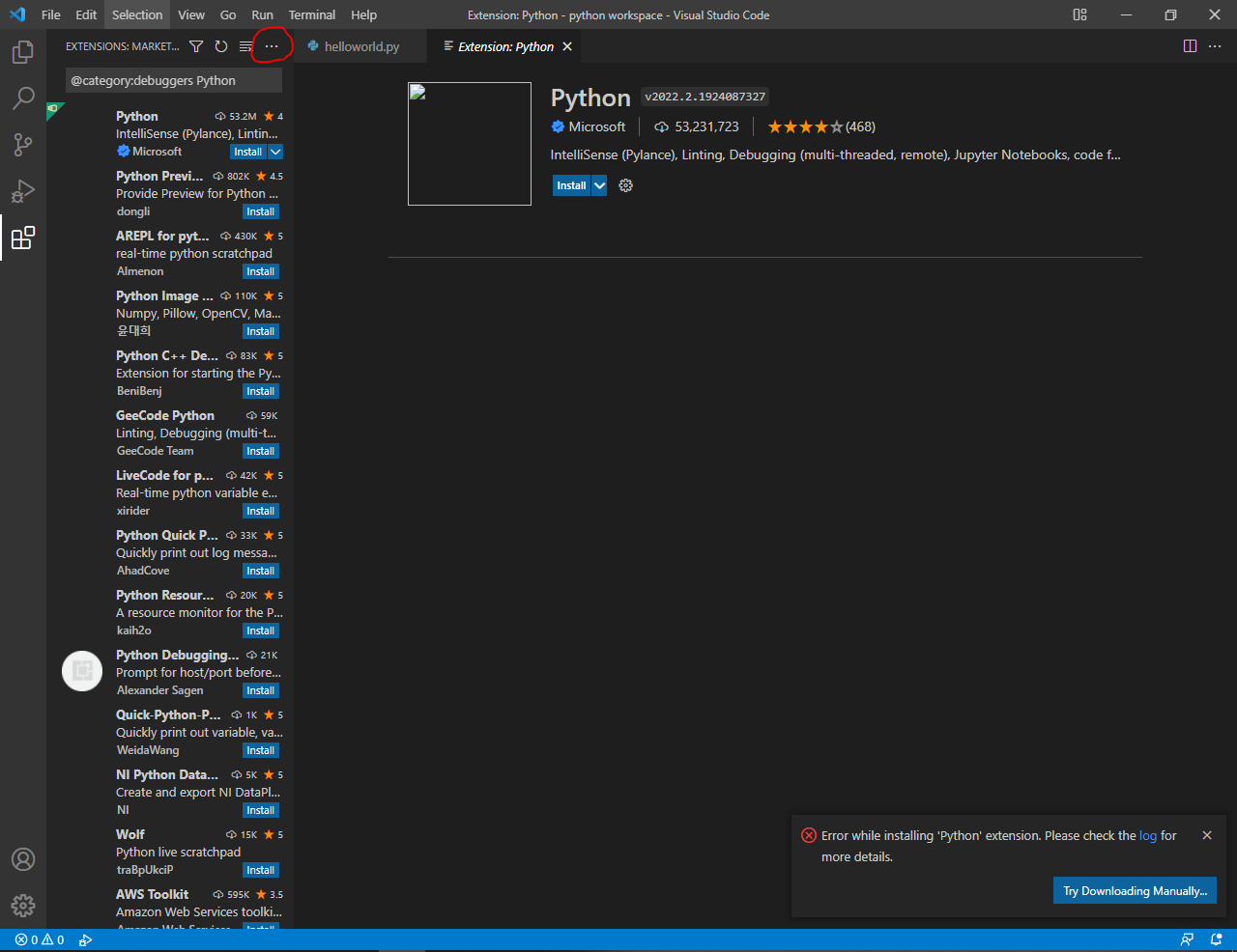 'Error while installing 'Python' extension. Please check the log for more details.' 란 오류창이 뜨고 해결이 안됩니다.
