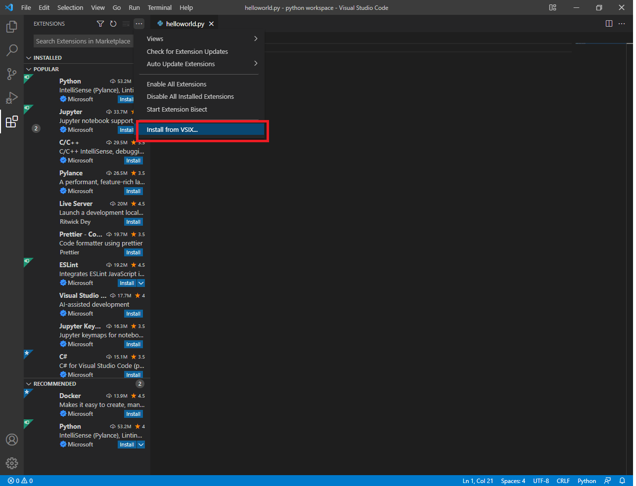 비주얼 스튜디오 코드로 돌아와 Extensions창 상단의 점 세개를 클릭합니다.