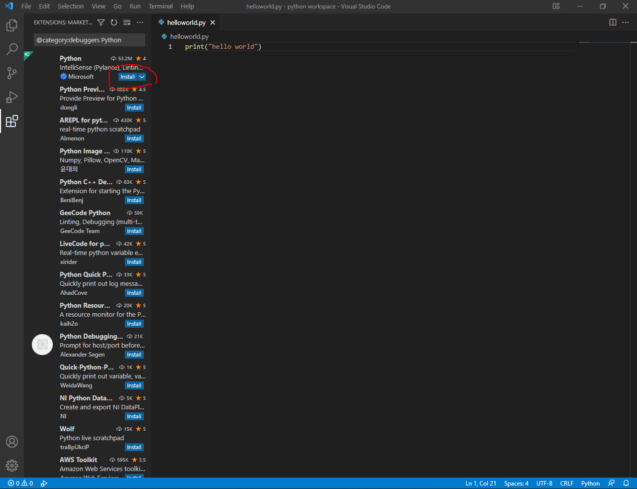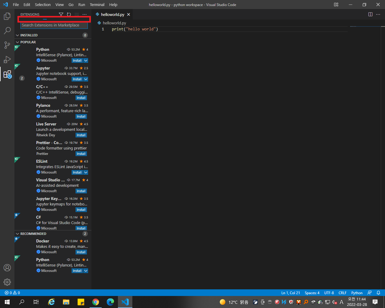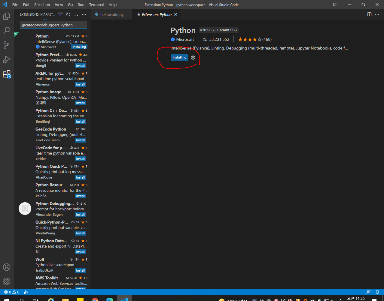 다음처럼 진행해 보니, 비주얼 스튜디오 코드에서 파이썬이 설치가 되지 않는 것입니다.